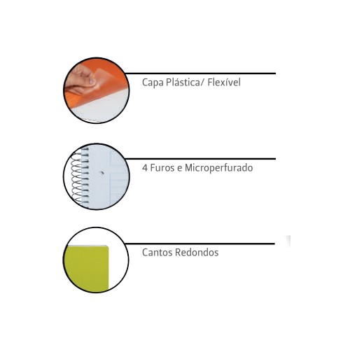 Caderno espiral em 4 cores sortidas com 100 folhas microperfuradas destacáveis, em papel de 80g com 4 furos para arquivo.
