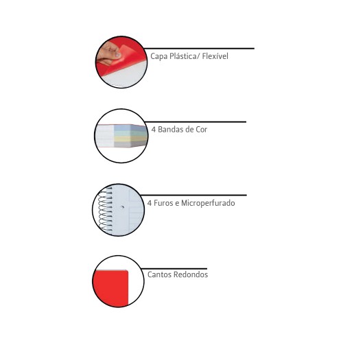 Caderno espiral em 4 cores sortidas, com 120 folhas em papel de 70g. Capa resistente em PP. Espiral branco.